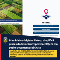 Începând de astăzi, municipalitatea ploieșteană va avea acces gratuit, în format digital, la extrasele de carte funciară pentru informare și extrasele din planul cadastral, prin intermediul platformei MyEterra, pusă la dispoziție de Agenția Națională de Cadastru și Publicitate Imobiliară (ANCPI), în colaborare cu Oficiul de Cadastru și Publicitate Imobiliară (OCPI) Prahova.
